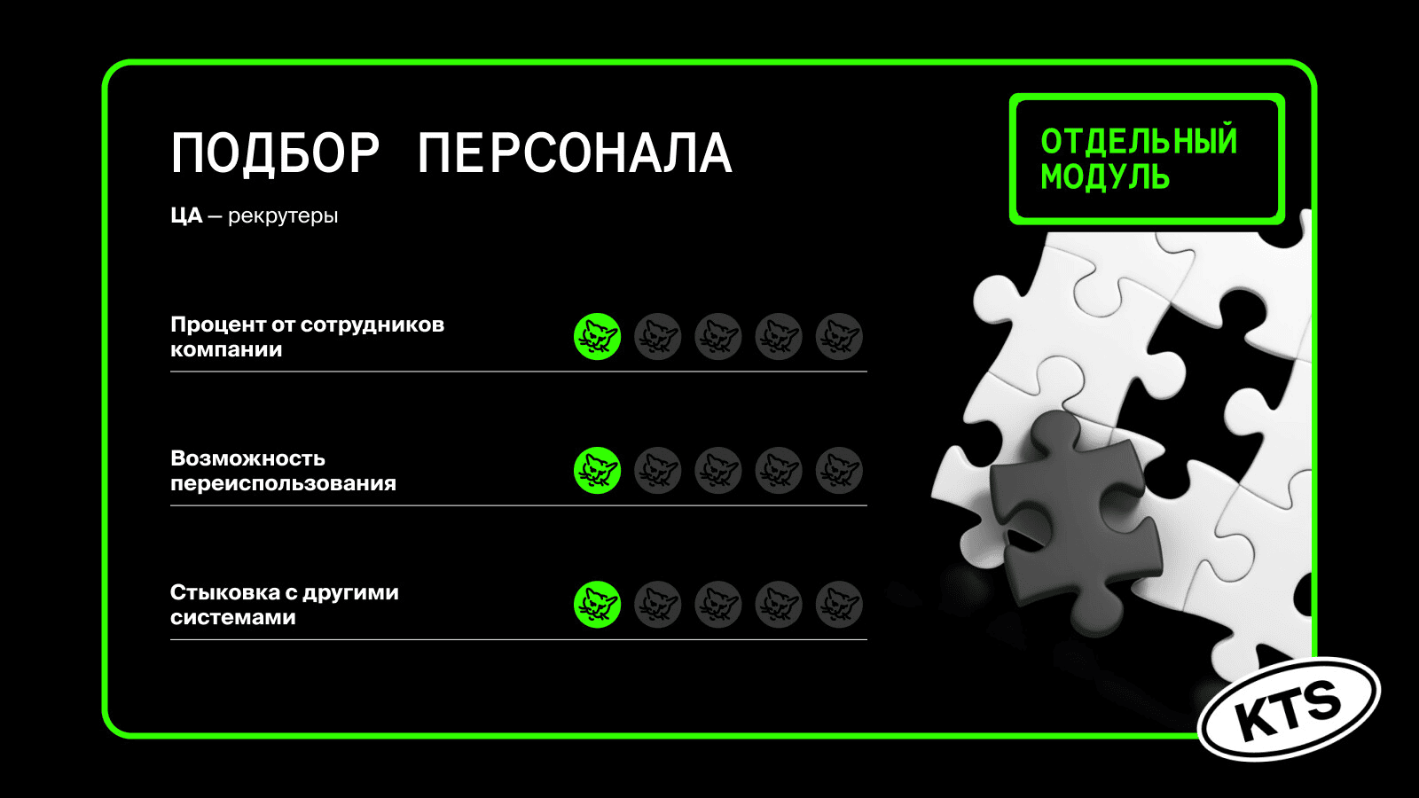 Подбор персонала эффективнее автоматизировать через отдельный модуль. Процент от сотрудников компании, которые пользуются этим инструментом — небольшой. Специфичность функций достаточно высокая — необходима CRM для соискателей. Стыковка же с другими системами — небольшая: необходимо лишь передавать заявки на подбор, перенаправлять данные подходящего кандидата на оформление приёма.