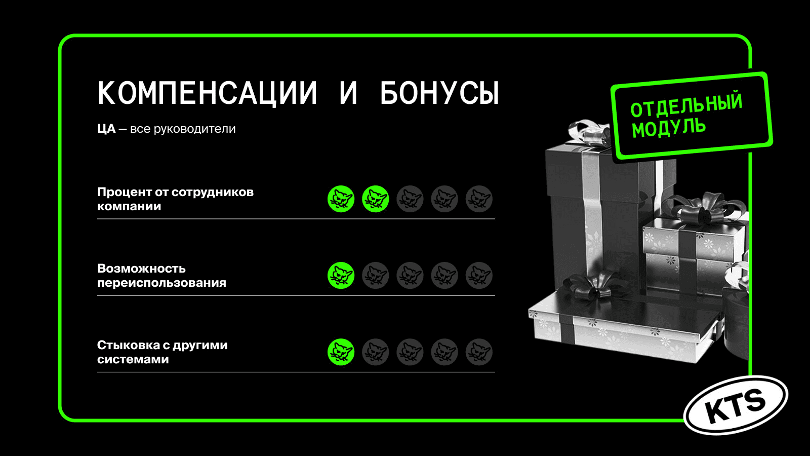 Компенсации и бонусы можно оставить в рамках отдельного модуля. Её функции сложно переиспользовать где-то в других процессах, а стыковка с другими системами небольшая — сотрудникам нужно загрузить данные по текущим вознаграждениям, по цепочке согласования и выгрузить данные по пересмотренным вознаграждениям.