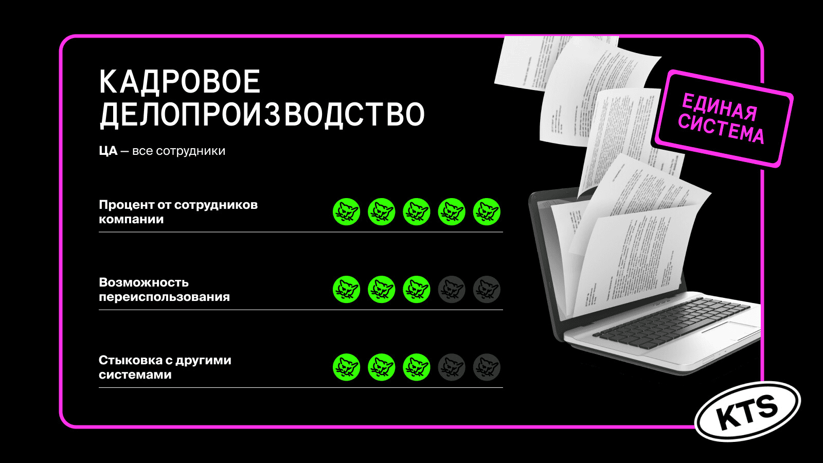 Кадровое делопроизводство оптимальнее внести в единую систему. Процент покрытия стремиться к 100, так как всем сотрудникам необходимо подписывать, например, заявления на отпуск, узнавать о своей зарплате в расчётном листе.