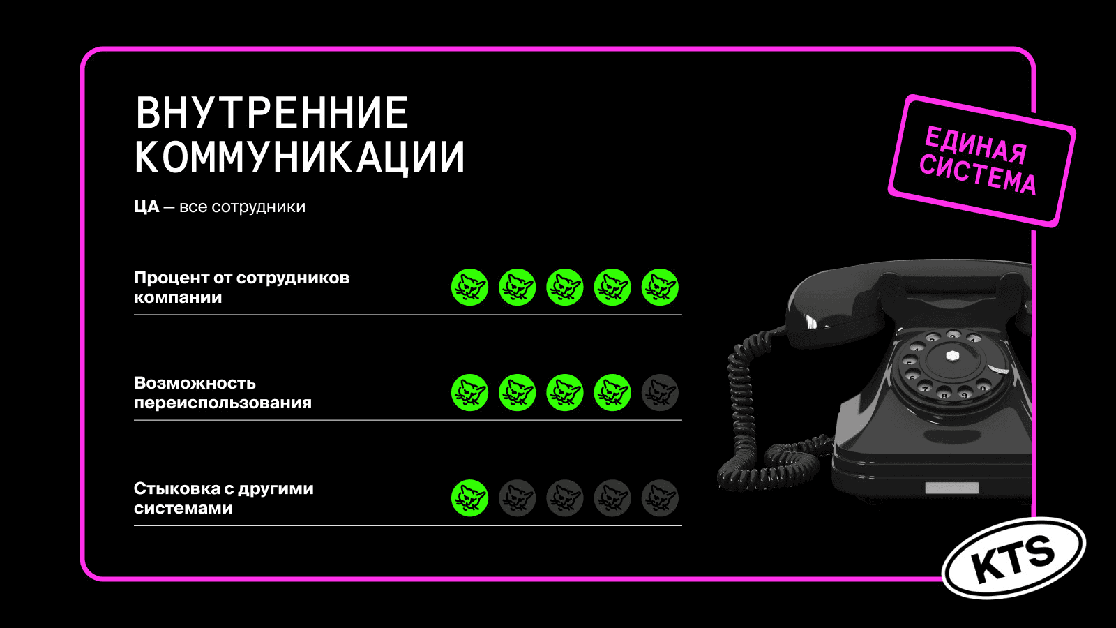 Внутриком желательно внести в единую систему. Цель любого внутрикома компании — достичь 100% покрытия сотрудников. Ключевая функция для задач внутренних коммуникаций — CMS (система управления контентом), в которой пишутся статьи и другие информационные материалы. Эту CMS можно переиспользовать при написании инструкций, ведения базы знаний, написания статей на сайт компании. Вывод — переиспользуемость у неё высокая, стыковка же с другими системами минимальна.