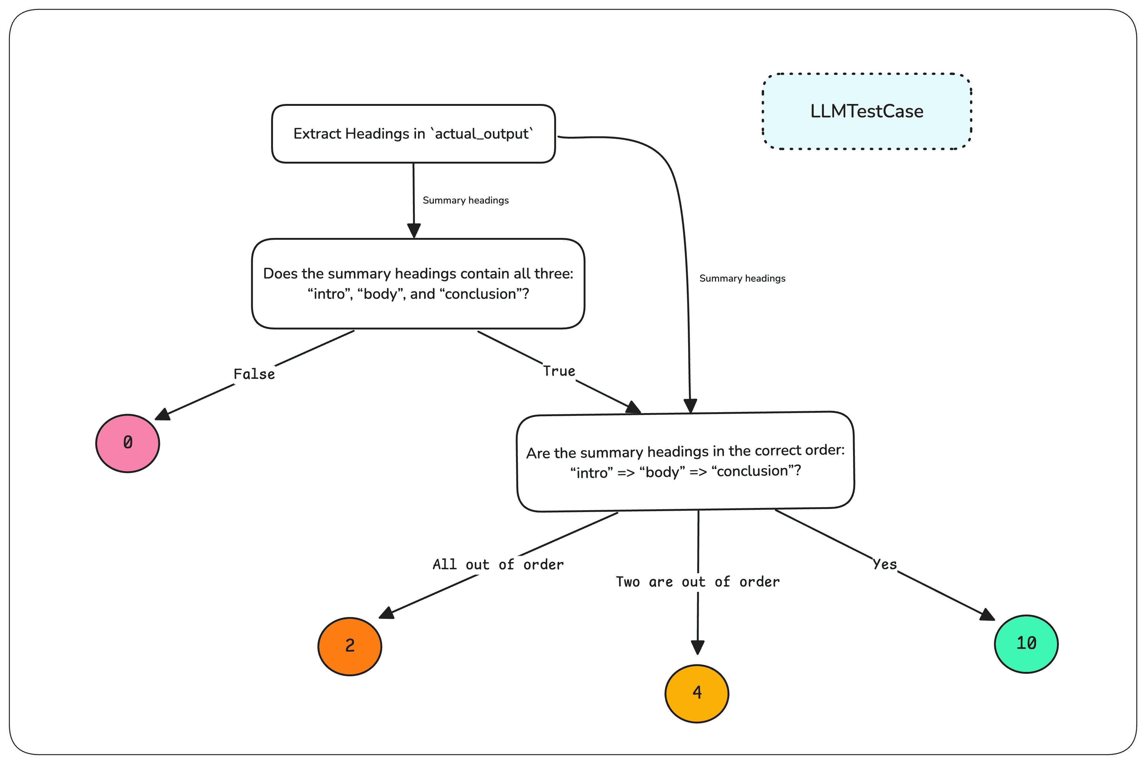 Пример: нужно оценить summary по встрече, которое обязательно должно включать три секции в правильной последовательности: Intro, Body и Conclusion. С DAG-метрикой вы можете: