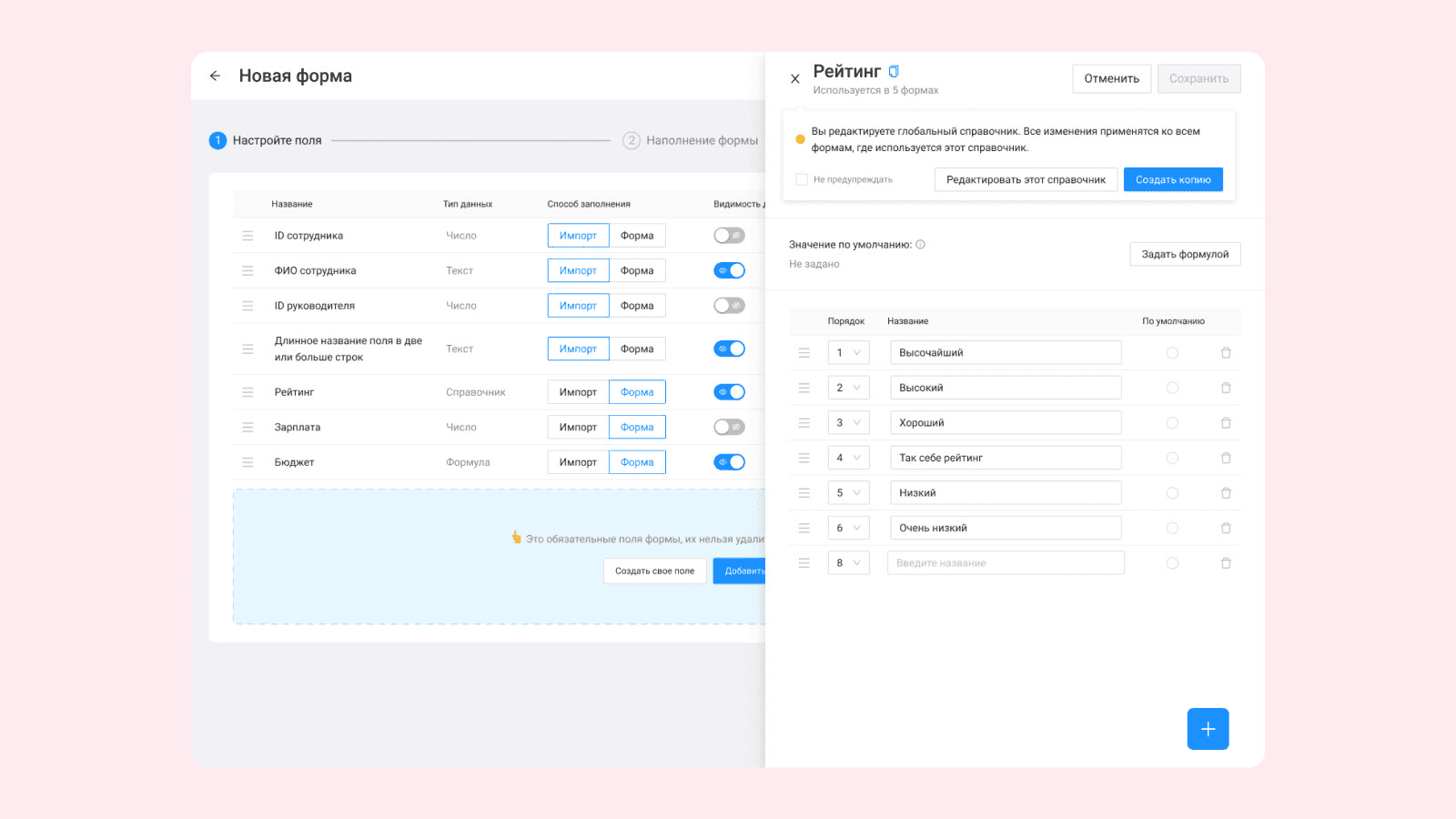Шаг 2: HR-менеджер добавляет в неё параметры, которые будут влиять на зарплату или сумму бонуса сотрудников, определяет бюджеты и рекомендации. Также он создает формулы, блокирует ячейки для ввода и прячет листы со служебной информацией.