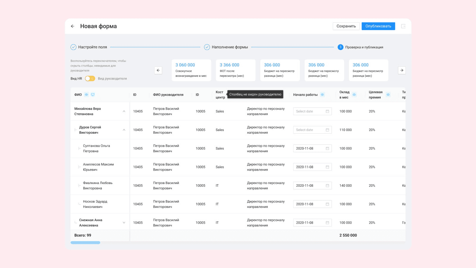 Во-вторых, HR загружает заполненную таблицу с данными сотрудников и рекомендациями в сервис, проверяет и отправляет руководителям.Форма с полями сотрудников, рекомендациями для пересмотра зарплат и выплаты бонусов.