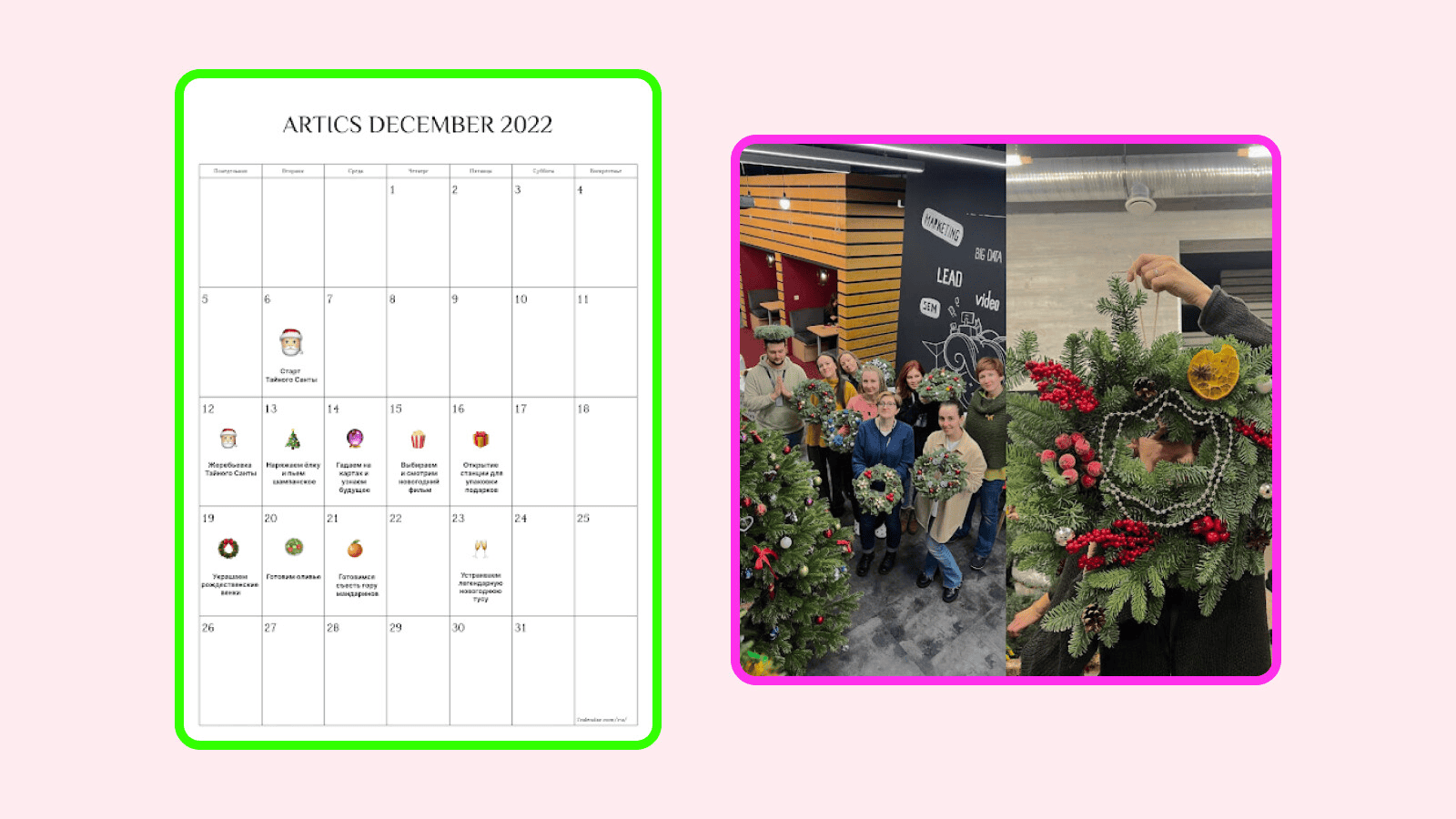 «Мы решили „растянуть“ праздник на целый месяц и постарались, чтобы он объединил всю команду, часть которой работает удалённо. В начале декабря внутри агентства анонсировали календарь с десятью предновогодними мероприятиями. Идеи многих встреч исходили от самих сотрудников, нам оставалось только организовать их.